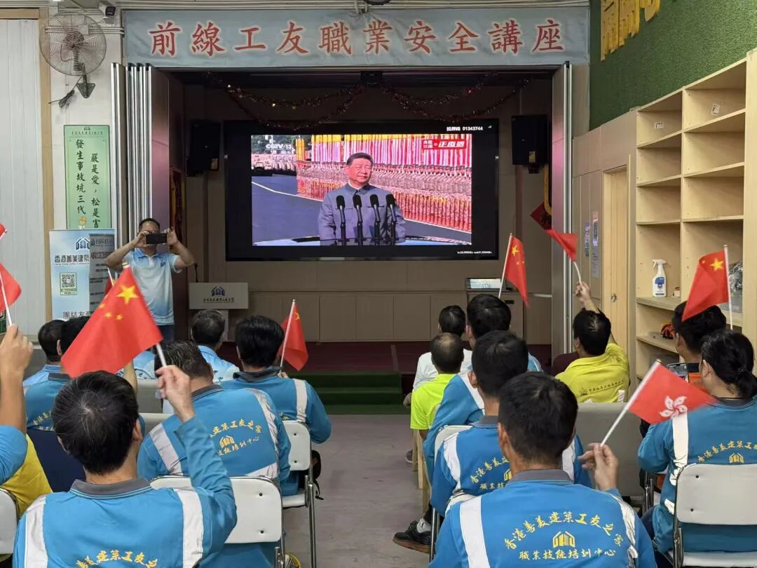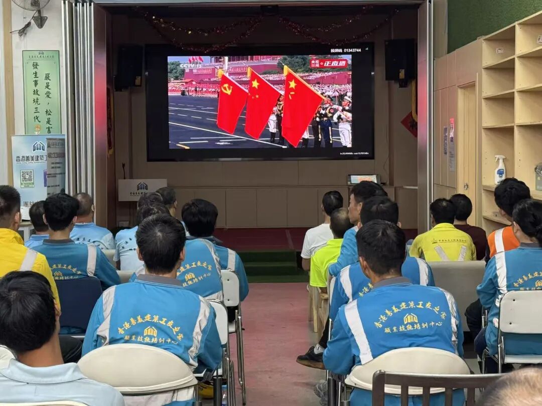 香港善美建築工友之家在今日(9月3日)組織會員工友觀看「紀念中國人民抗日戰爭暨世界反法西斯戰爭勝利80周年閱兵儀式」。眾多工友齊聚一堂,共同見證這一莊嚴而神聖的時刻。