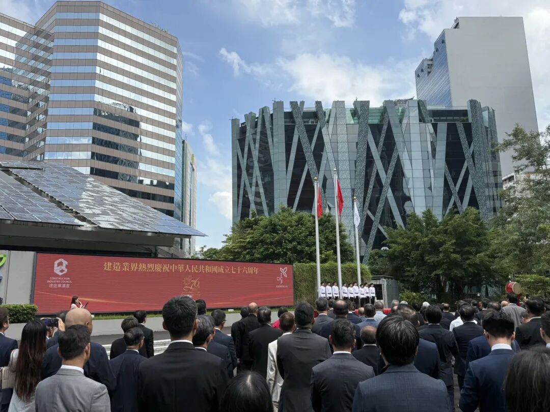 儀式現場氛圍莊嚴而熱烈:香港中國婦女會丘佐榮學校中國鼓隊現場擊鼓演奏,鼓點雄勁激昂,增添濃厚文化色彩;其後在香港建造學院升旗隊的帶領下,中華人民共和國國旗與香港特別行政區區旗、建造業議會會旗伴隨《义勇军进行曲》徐徐升空。建造業從業者們肅立行注目禮,齊唱國歌,以質樸而真誠的方式表達對祖國的赤誠熱愛與美好祝願。