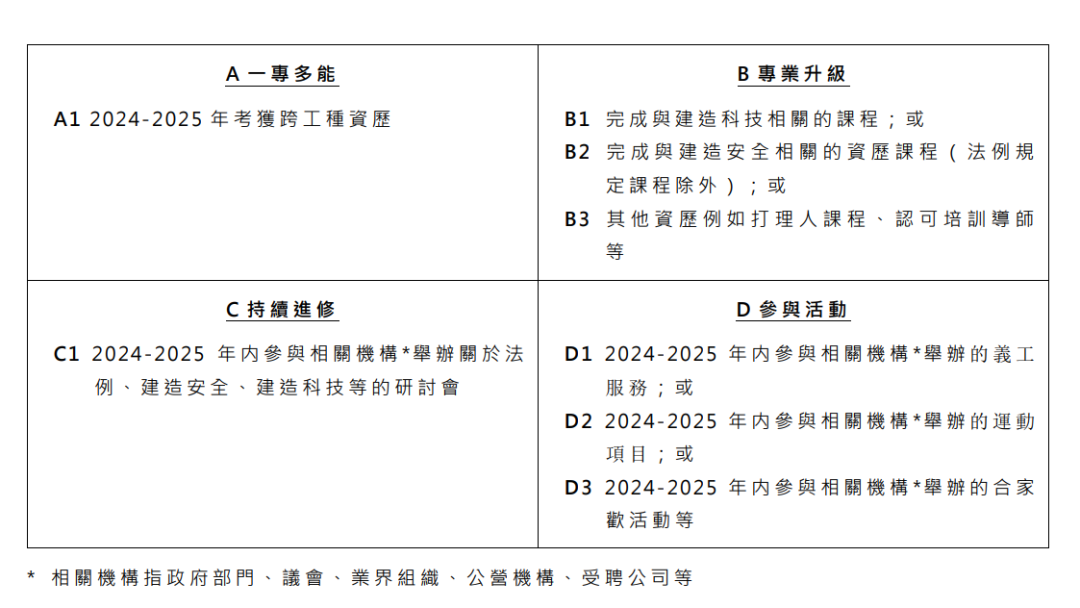 • B. 專業升級:考獲中工晉大工等升級資格、完成建造科技(如機械人、組裝合成建築法)或建造安全(除“建造業安全訓練証明書”外)培訓、獲議會認可工地導師資歷;