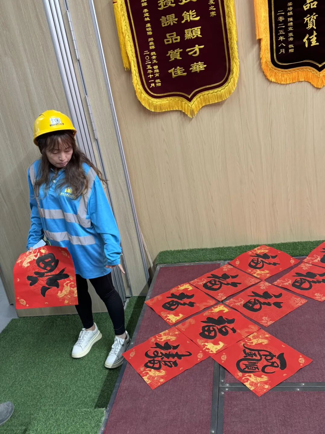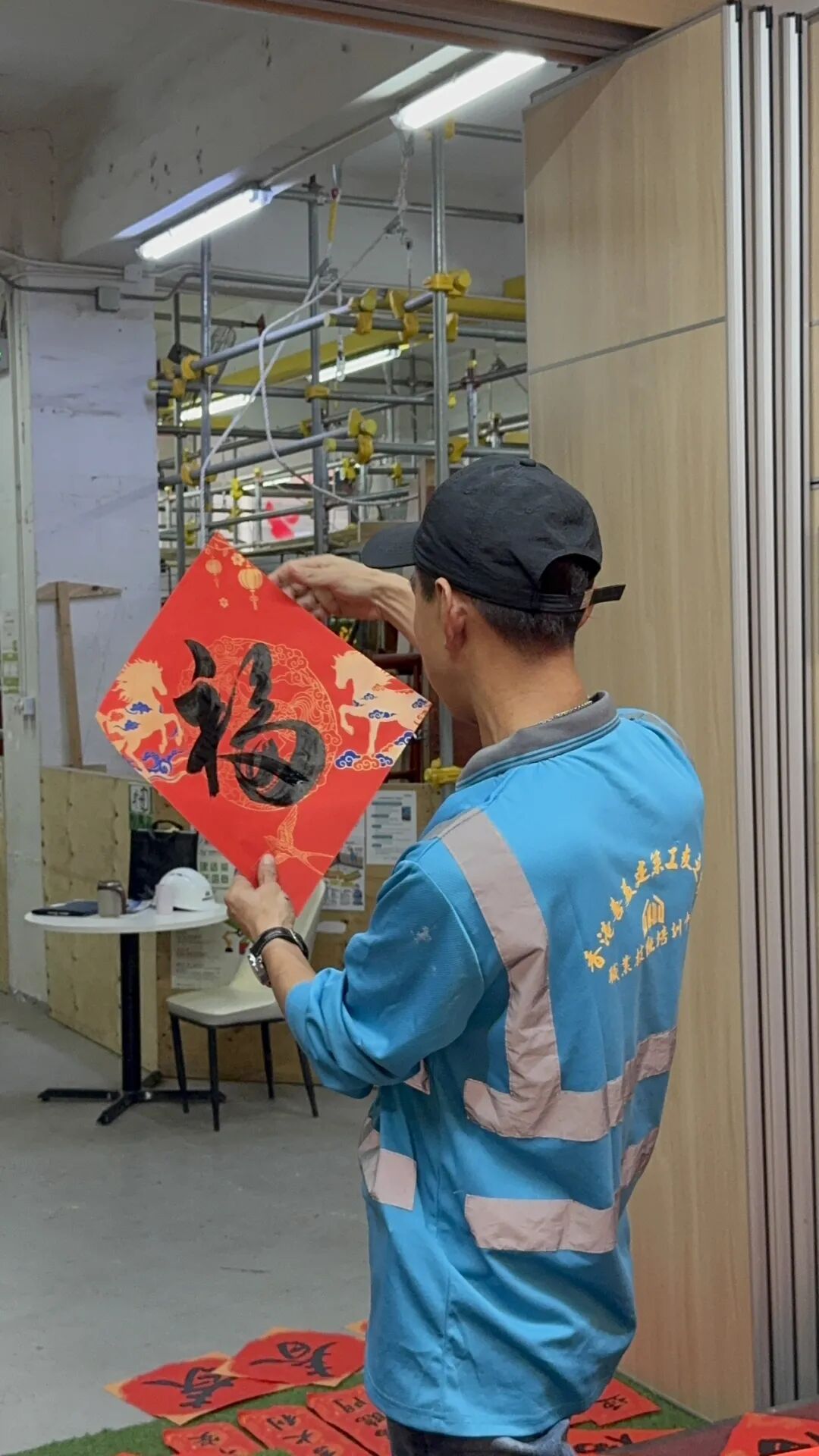 活動現場張燈結綵,紅彤彤的揮春紙整齊鋪展,陳煒顧問手持毛筆,蘸取濃墨,筆走龍蛇間,「馬到功成」「迎春接福」「平安喜樂」「工作順利」等寓意吉祥的賀語躍然紙上,既貼合馬年新春的喜慶主題,更精準呼應了建築工友對事業順遂、闔家安康的殷切期盼。工友們身著工裝有序排隊,臉上洋溢著淳樸的笑容,不少人特意叮囑陳煒顧問書寫專屬祝福,現場墨香與歡聲笑語交織,盡顯濃厚的節日氛圍與鄉誼溫情。接過墨跡未乾的揮春,來自汕尾的資深工友李師傅難掩喜悅:「手寫的揮春最有年味,陳顧問的字蒼勁有力,這份祝福暖到心坎裡,新一年幹活更有勁頭了!」